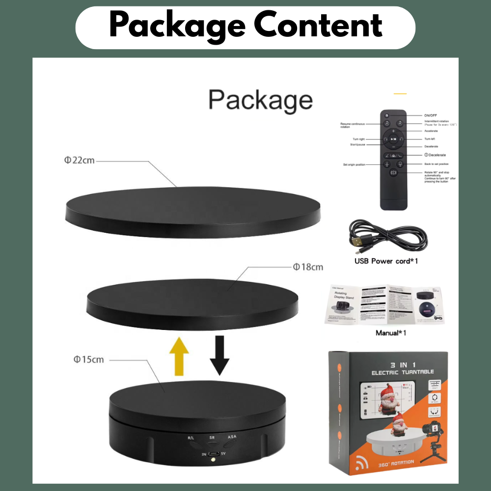 - Package Content: 1 × Electric Rotating Display Stand, 1 × Remote control (without battery), 1 × 18cm replacement panel, 1 × 22cm replacement panel, 1 × USB Charger, 1 × User Manual