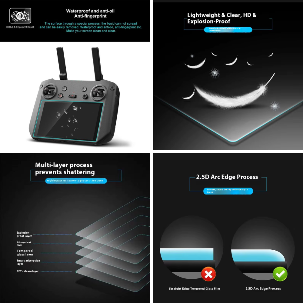 Perfectly cut for the D JI Mini 4 Pro RC2, this protective film is an essential accessory for drone pilots who want durable protection without compromising sensitivity or screen clarity.