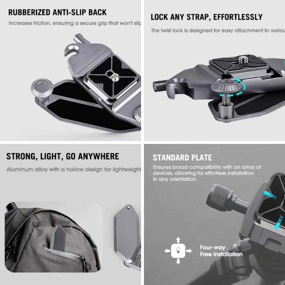 Engineered with an anti-slip rubber back pad, it ensures a firm grip on your backpack strap, preventing unwanted movement or instability. The precise locking structure keeps your camera stable even during hikes, cycling, or fast-paced shooting.