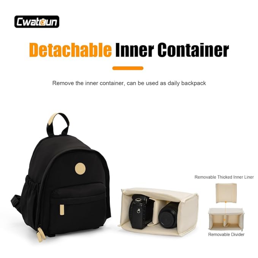 Cwatcun Small Camera Backpack with 1 Camera Body, 1 lens & Tripod Strap | Black